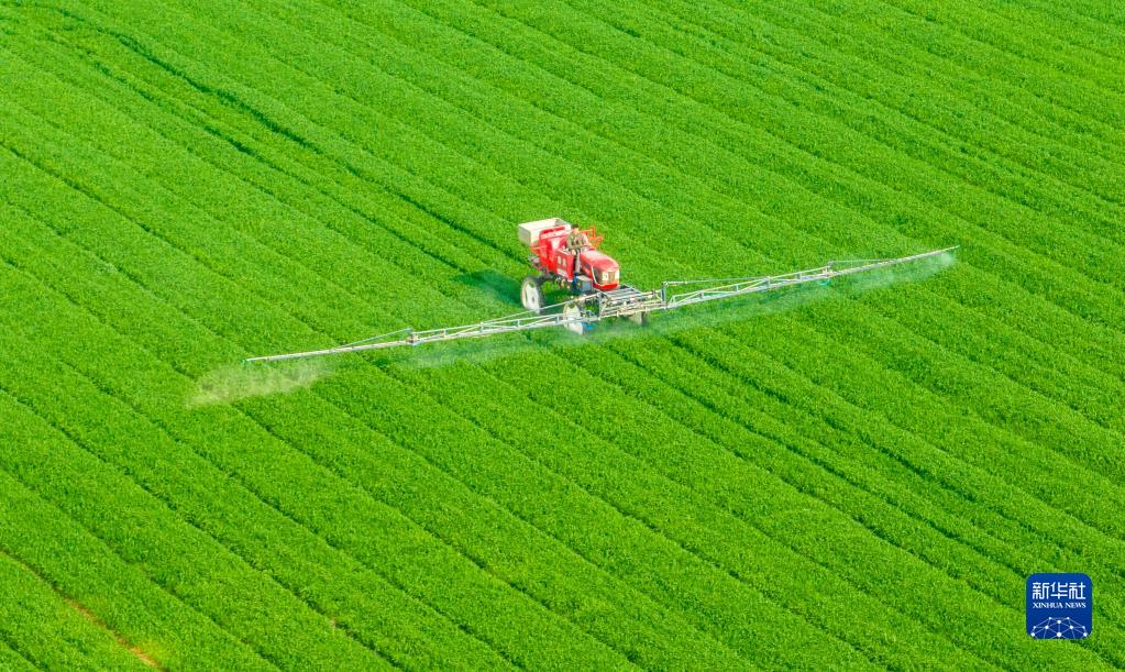 3月28日,江苏省海安市李堡镇中凌村农民驾驶植保机械进行小麦病虫害防治作业(无人机照片)。