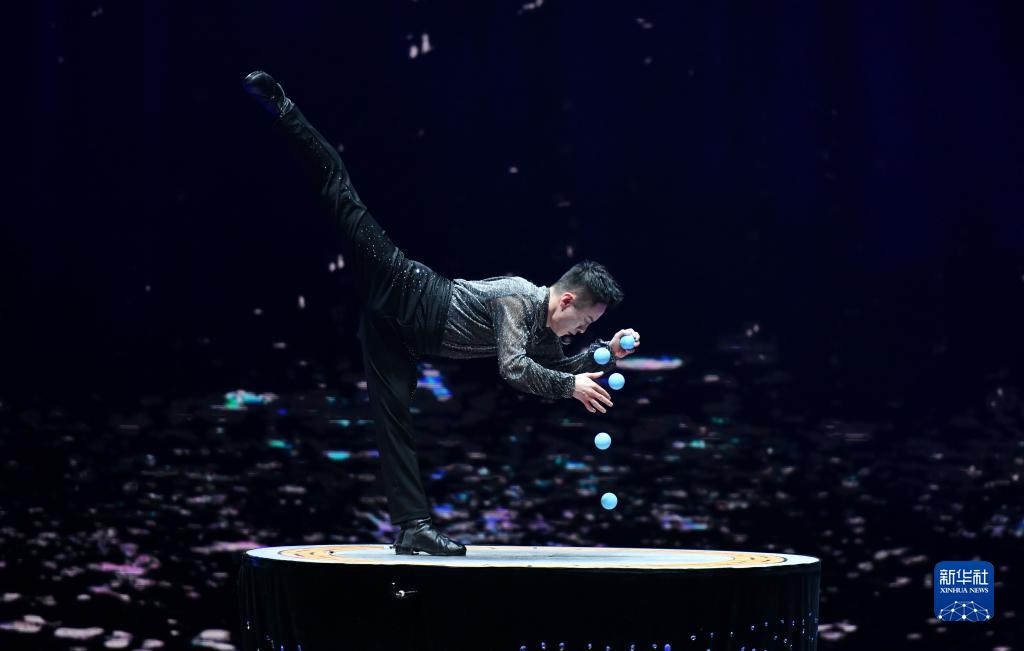 3月28日,在位于山东省济南市的山东省会大剧院,演员表演杂技节目《雨中狂想·球技》。