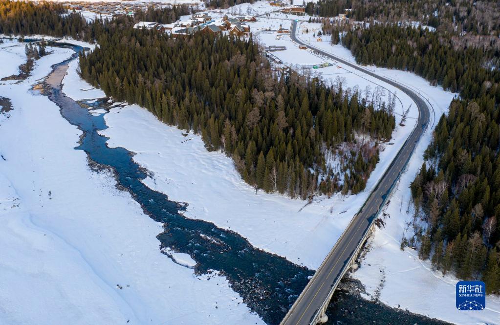 3月28日拍摄的跨过喀纳斯河的G219国道(无人机照片)。