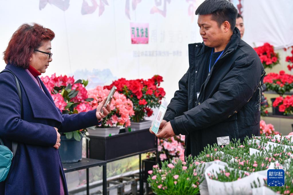 3月28日,游客在贵州省毕节市百里杜鹃管理区花卉展示点选购花卉时扫码付款。