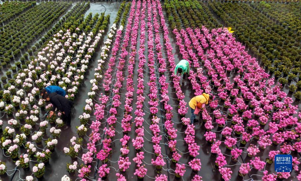 3月28日,农民在贵州省毕节市百里杜鹃管理区汇境花卉基地修剪花枝(无人机照片)。
