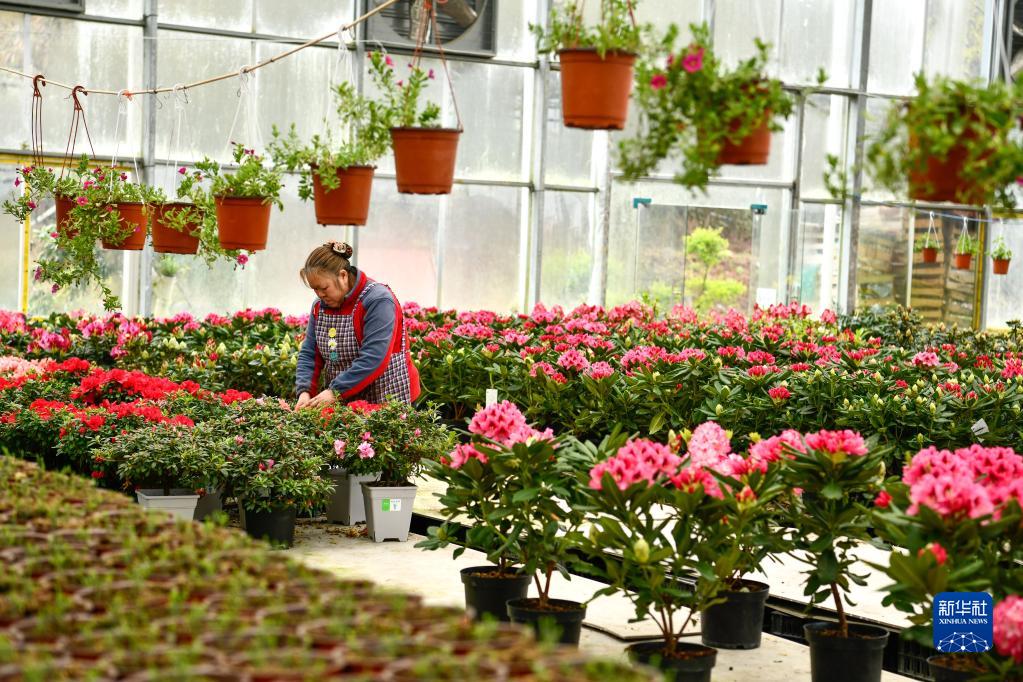 3月28日,农民在贵州省毕节市百里杜鹃管理区汇境花卉基地管护花卉。