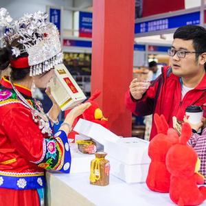 3月29日,在湖南国际会展中心,一名女子通过直播推销商品。