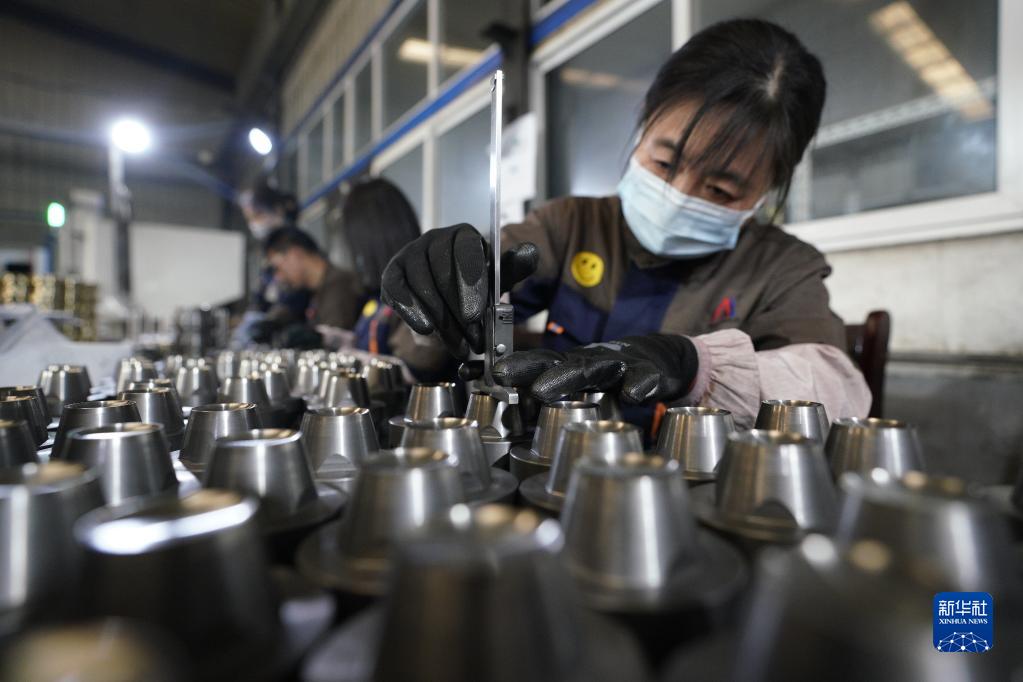 3月29日,沧州渤海新区黄骅市安迪模具有限公司工人在生产车间测量产品精度。