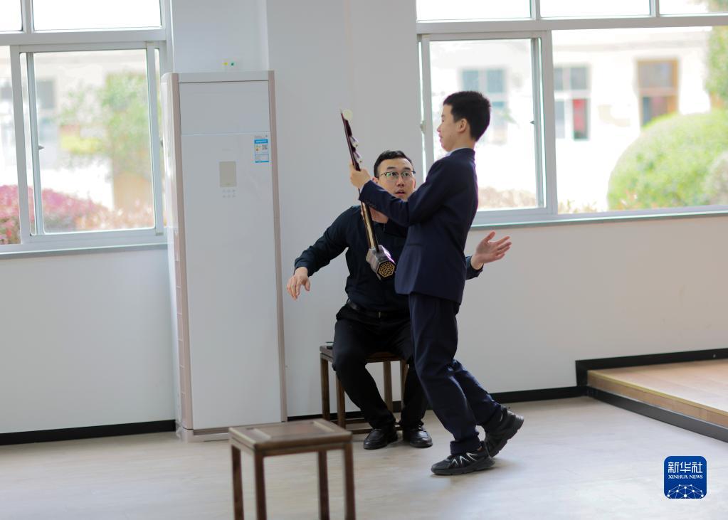 3月29日,在江苏无锡梅村实验小学,二胡老师纪海军在鼓励学生陈宇豪。