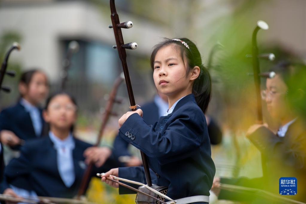 3月29日,江苏无锡梅村实验小学学生在练习二胡。