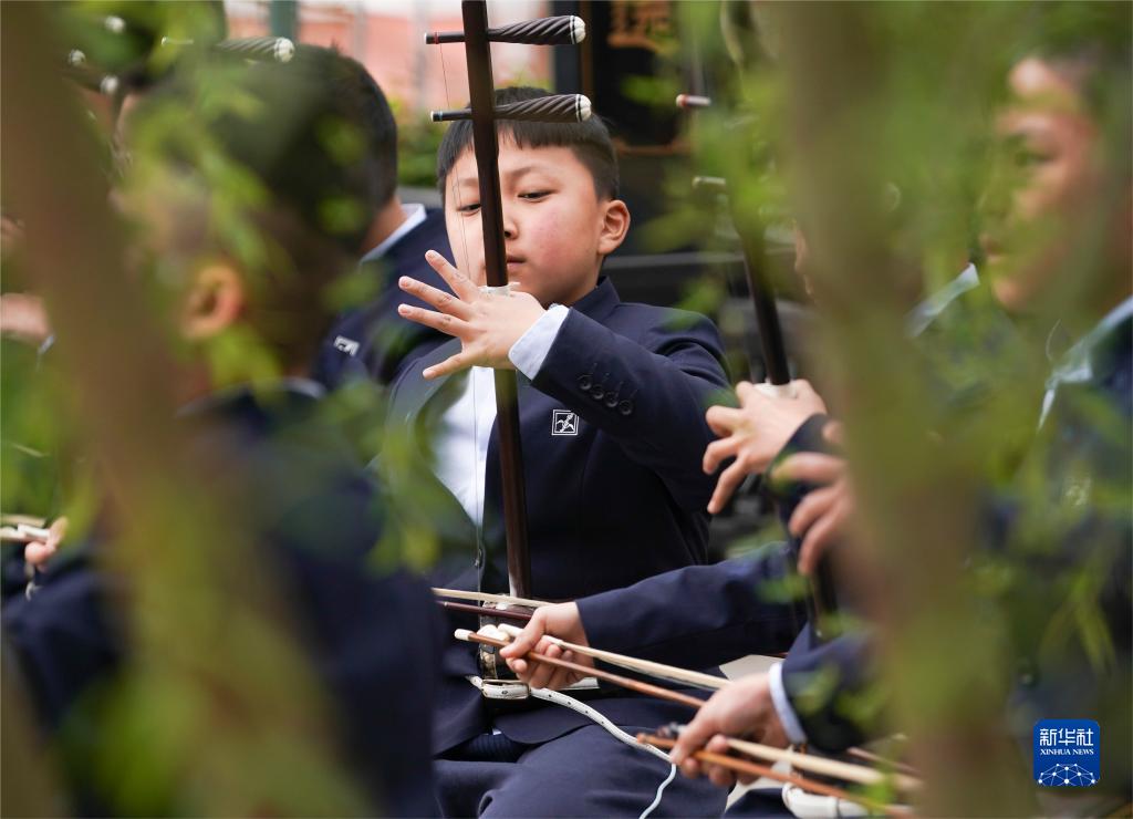3月29日,江苏无锡梅村实验小学学生在演奏二胡。