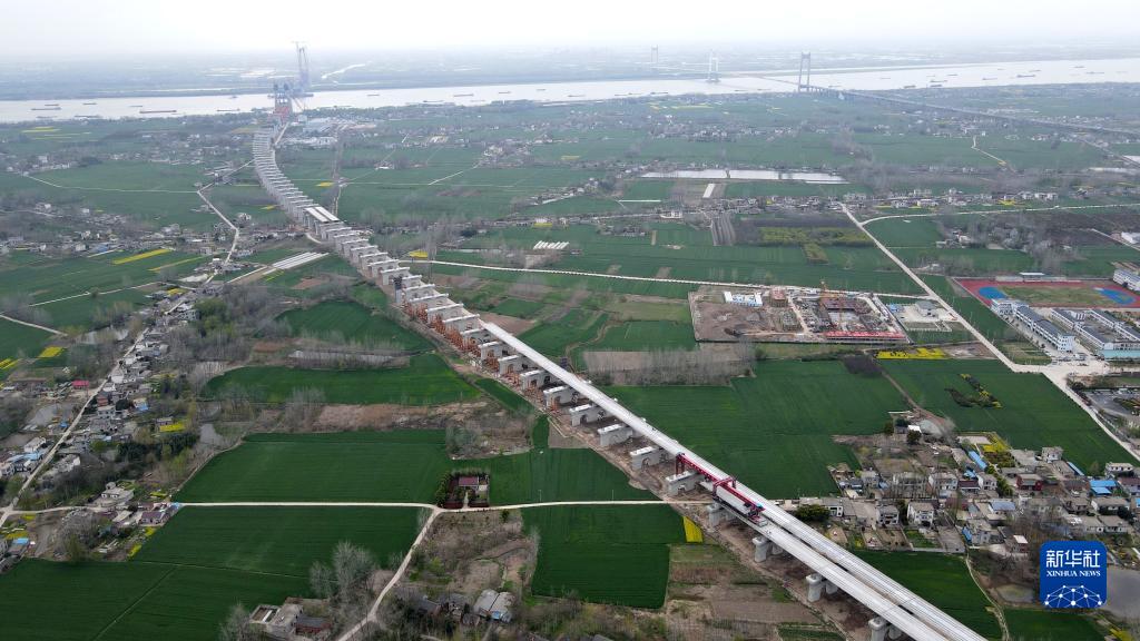 这是3月29日拍摄的中铁四局巢马城际铁路箱梁架设现场(无人机照片)。