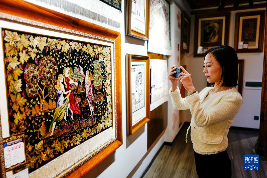 3月21日,游客在银河丝坊观赏出口海外的丝毯产品。
