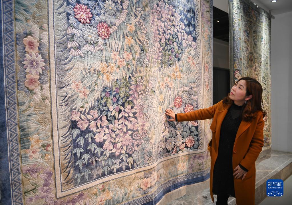 3月21日,四川阆中一家企业工作人员在介绍阆中丝毯。
