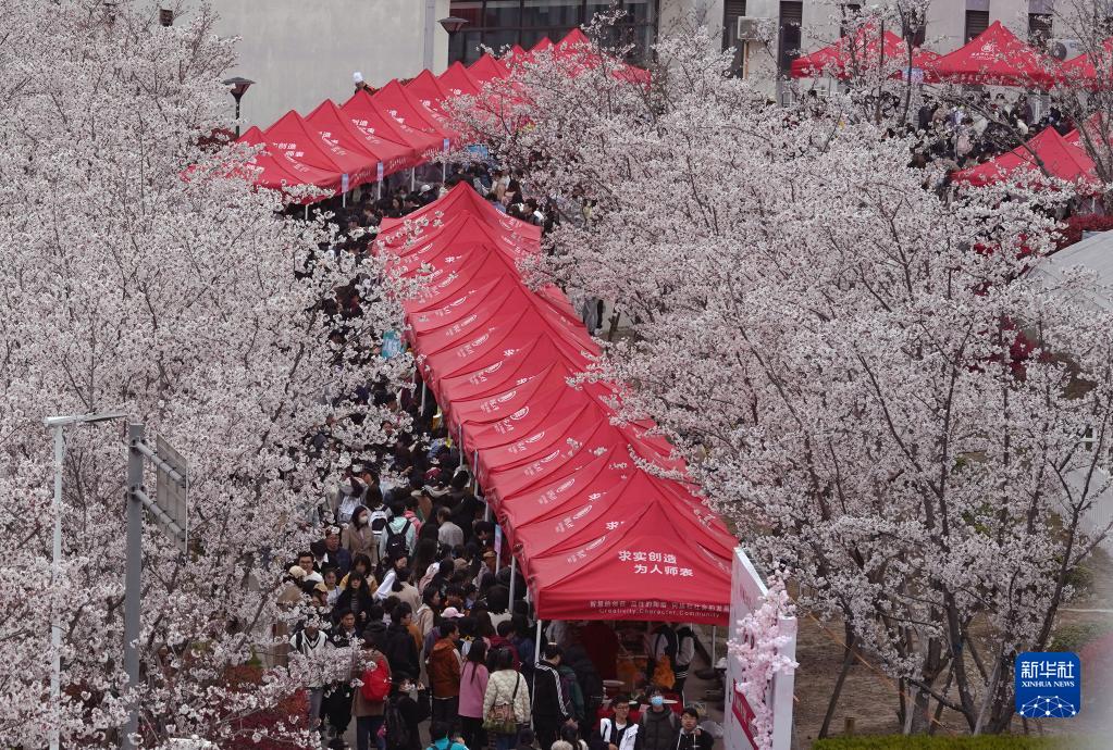 “华东师范大学第三十五届节粮月暨第九届食品节”活动现场,掩映在樱花林中(3月29日摄)。