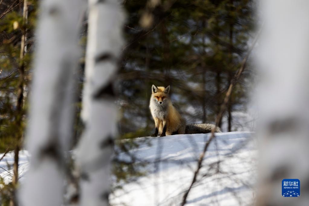 3月29日,一只赤狐在喀纳斯风景区觅食。