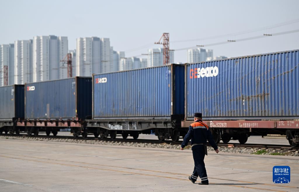 3月29日,在天津开发区盛铁物流有限公司,工作人员对天津至土耳其中欧班列进行巡查。