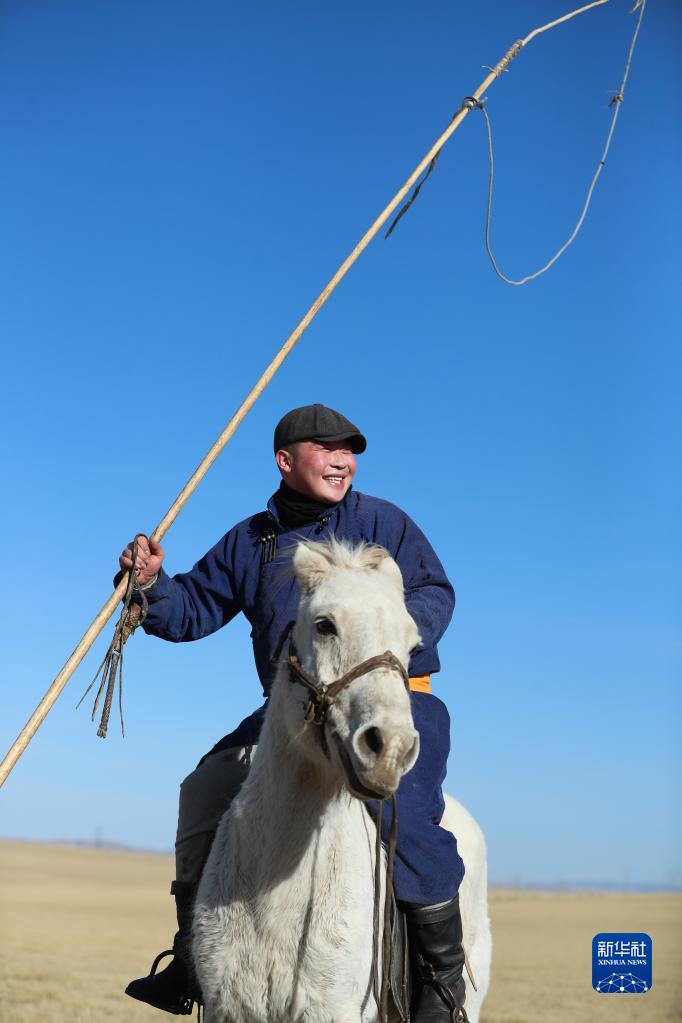 春日到来,内蒙古锡林郭勒盟西乌珠穆沁旗天气转暖,当地牧民赶着马匹,来到草原上驯马。