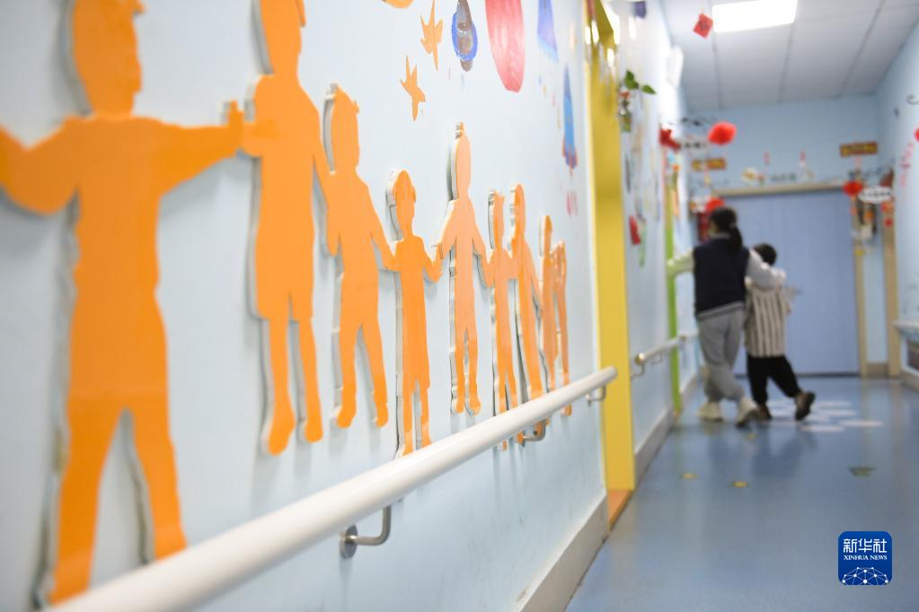 3月29日,一名老师带着自闭症儿童进教室上课。