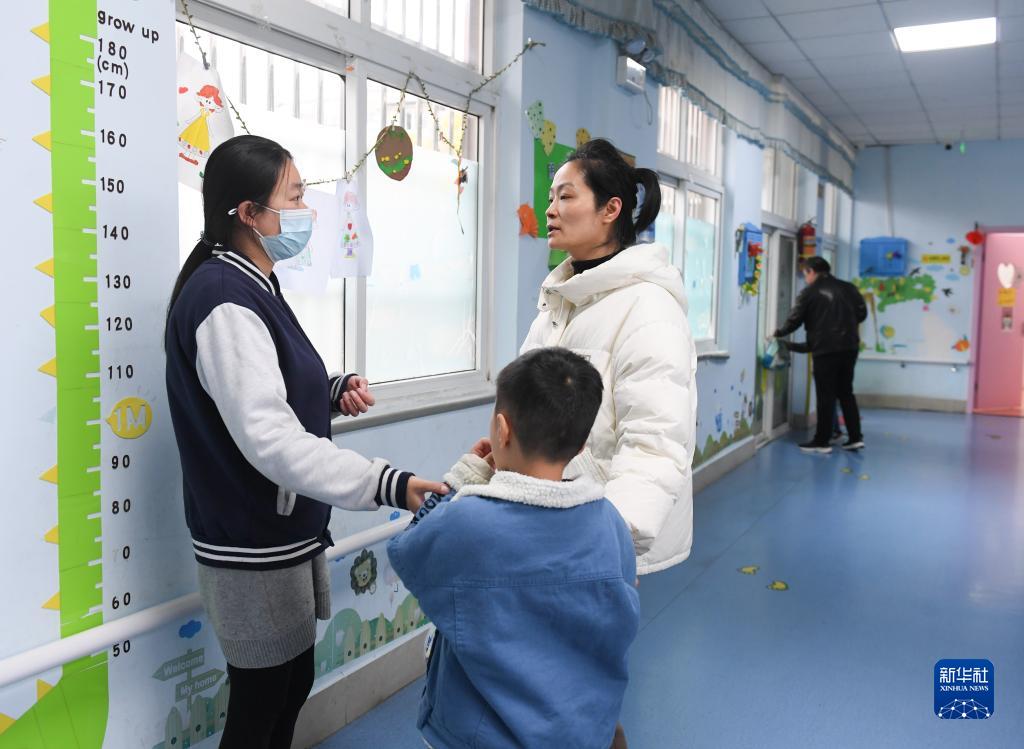 3月29日,一名家长(左三)在课后向老师了解孩子的状况。