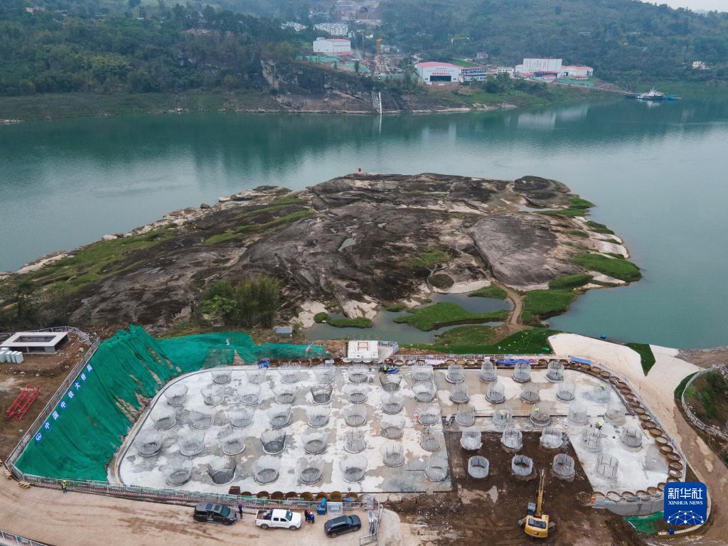 这是在重庆市涪陵区拍摄的石沱长江大桥南岸主塔的施工现场(3月29日摄,无人机照片)。