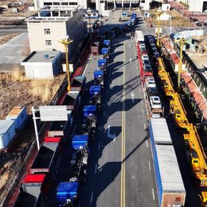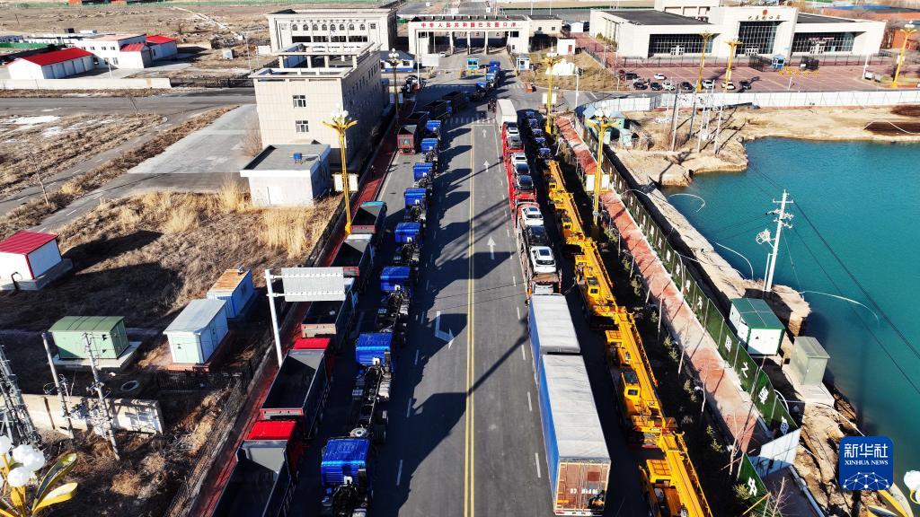 3月29日,来自哈萨克斯坦的货车和即将出口的车辆在巴克图口岸执勤民警引导下有序出境(无人机照片)。
