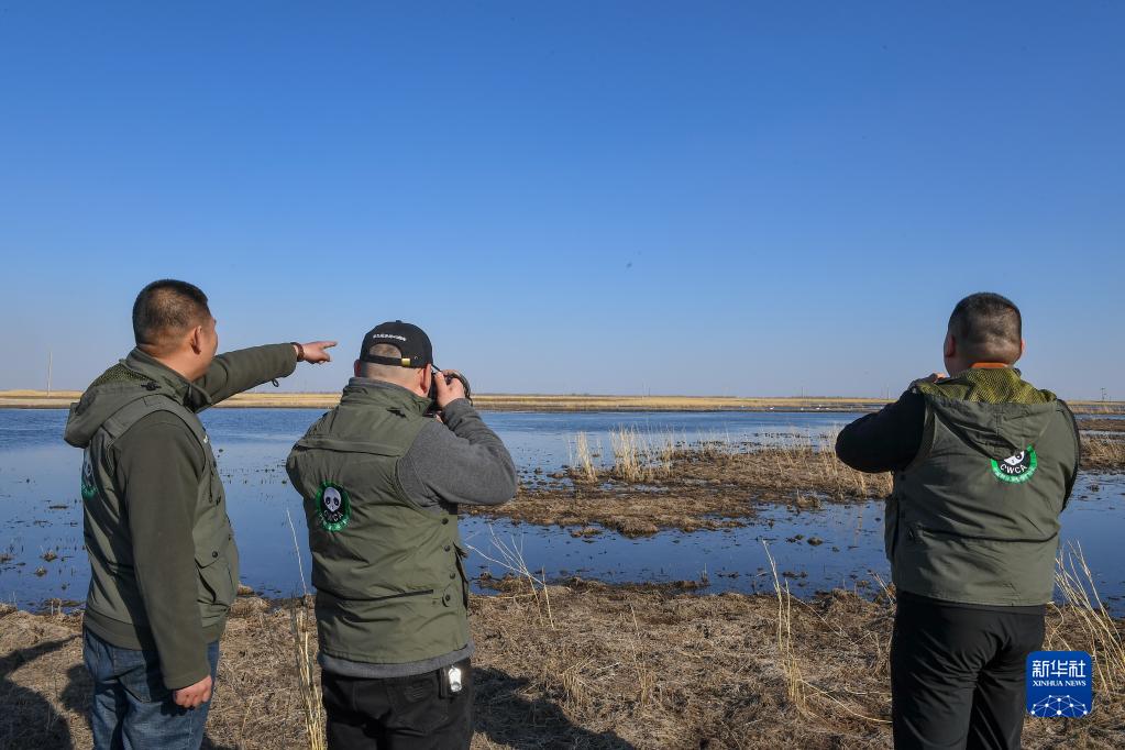 3月28日,在吉林省白城市镇赉县湿地,中国野生动物保护协会吉林白城护飞队队员王凯(左)、姜海涛(中)和刘聪观察、拍摄候鸟迁徙路线。