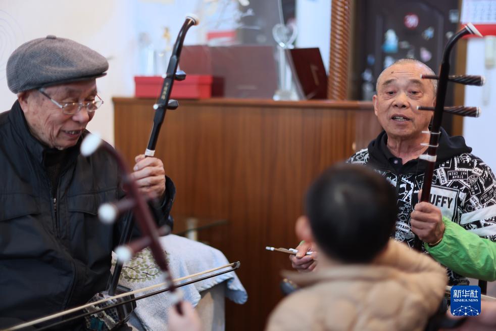 3月29日,钱福基(左)、钱建平(右)和家人在江苏无锡家中合奏二胡。