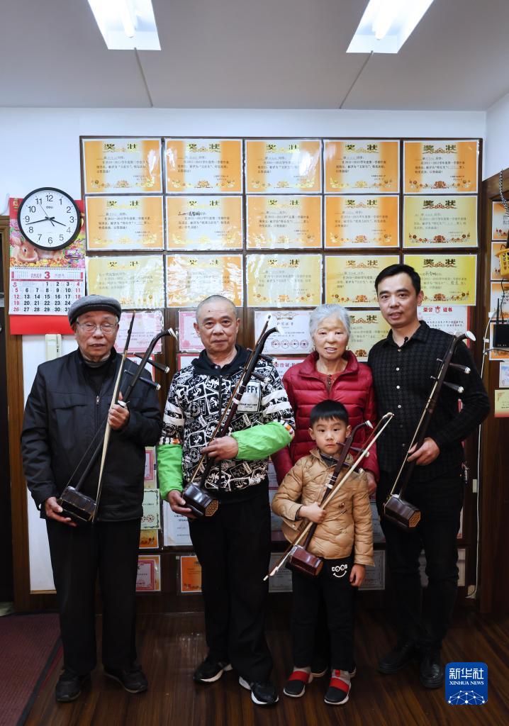识谱、拉弦样样不懂,钱福基四处讨教,然后回家摸索练习,慢慢掌握二胡演奏技巧。受他的影响,儿子钱建平也爱上了二胡演奏。生活条件越来越好,孙子钱钧在女儿钱智娴5岁时便开始请专业二胡老师授课,父女俩一起学习,共同提高。2019年,钱智娴获得第四届“敦煌杯”中国二胡演奏比赛非职业少年B组金奖。如今,钱钧7岁的儿子钱智臣以姐姐为榜样,也开始练习二胡。