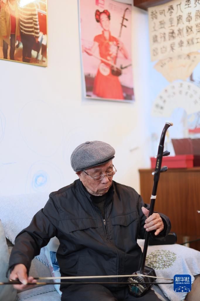 3月29日,钱福基在江苏无锡家中演奏二胡。