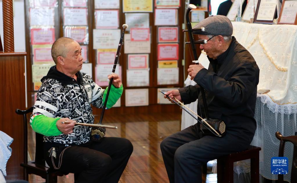 3月29日,钱福基(右)和儿子钱建平在江苏无锡家中合奏二胡。