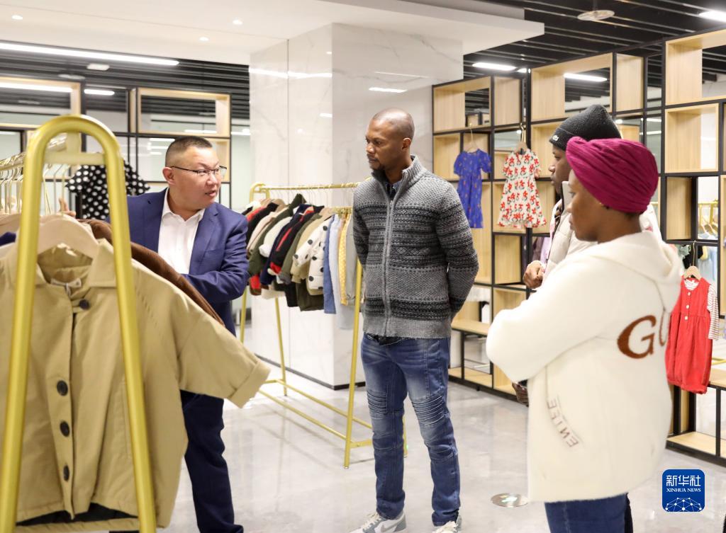 3月30日,织里镇一家童装企业的负责人姚东(左)向“洋主播”团队介绍童装。