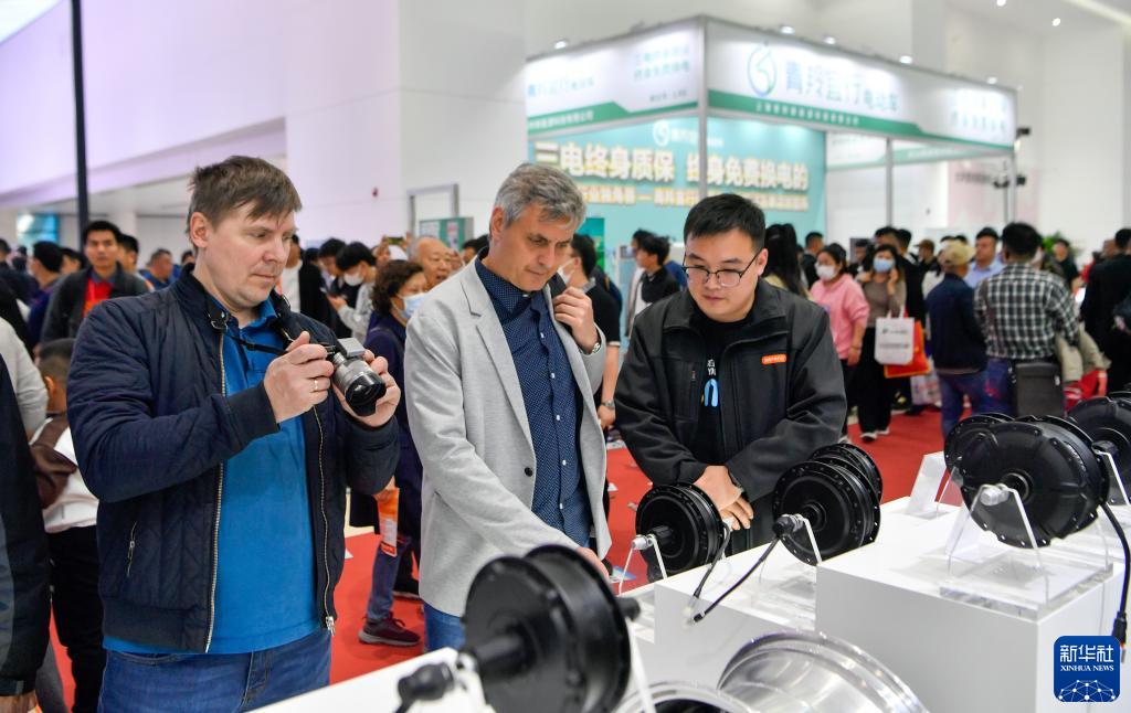 3月30日,来自俄罗斯的两位研发技术人员在展会会场与国内某电动车部件生产企业洽谈。