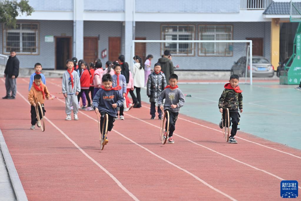 在广西梧州市蒙山县夏宜民族学校,学生们在体育课上滚竹环(2月22日摄)。