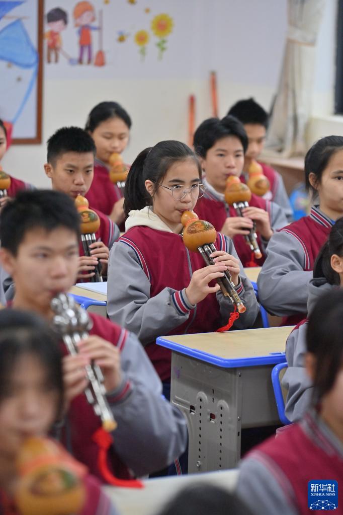 3月29日,在广西梧州市苍梧县第一初级中学,学生们在吹奏葫芦丝。