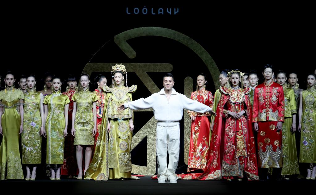 3月30日,在北京举行的中国国际时装周2023秋冬系列“六礼·张效奇”时装发布上,时装设计师张效奇(中)和模特谢幕。