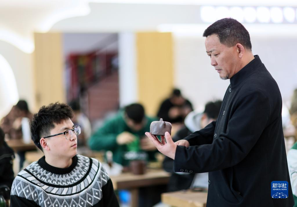 3月30日,授课老师范伟群在江苏宜兴西望紫砂陶瓷专业合作社指导学员制作紫砂壶。