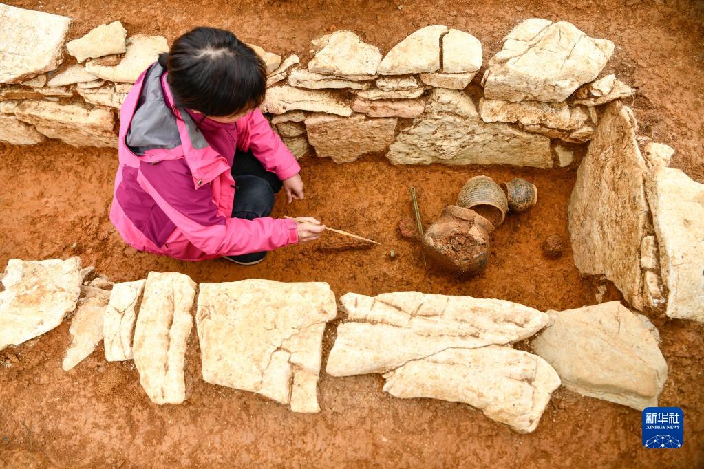 3月30日,在贵州贵安新区大松山墓群挖掘现场,贵州省文物考古研究所所长周必素在介绍出土文物情况。