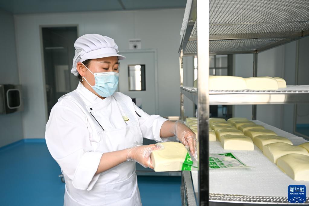 3月31日,在镶黄旗民族传统奶制品产业园的一家奶制品企业生产车间,工作人员包装奶豆腐。