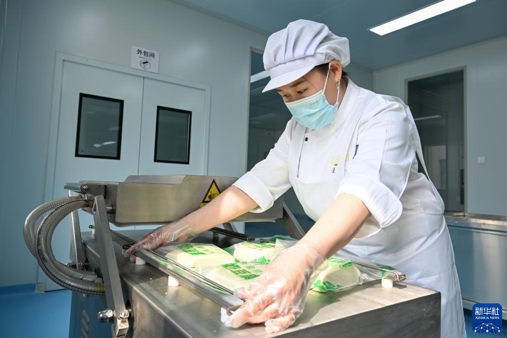 3月31日,在镶黄旗民族传统奶制品产业园的一家奶制品企业生产车间,工作人员包装奶豆腐。