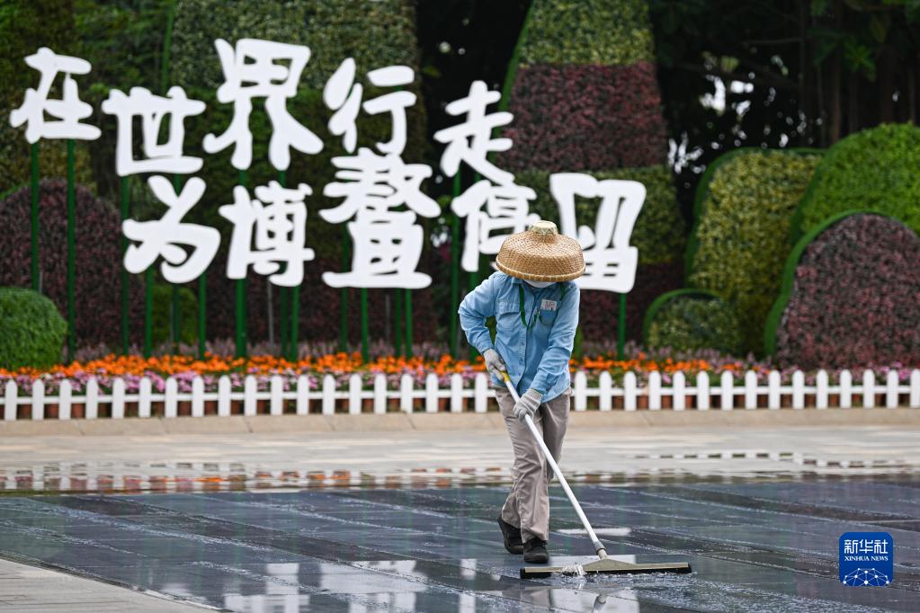 3月31日,工作人员在博鳌亚洲论坛国际会议中心清理地面的雨水。