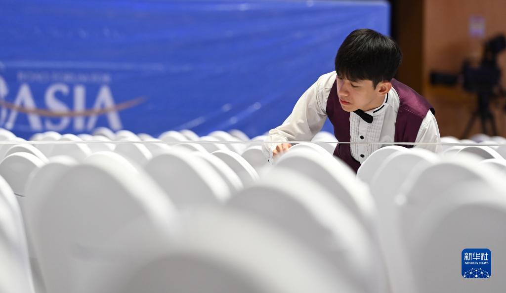 工作人员在博鳌亚洲论坛主会场进行准备工作(3月27日摄)。