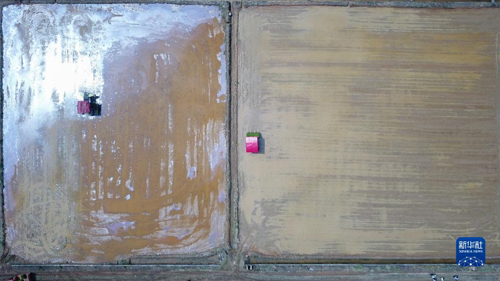 3月31日,在湖南省浏阳市龙伏镇的双季稻种植示范基地,农民驾驶抛秧机、插秧机进行抛秧、插秧作业(无人机照片)。