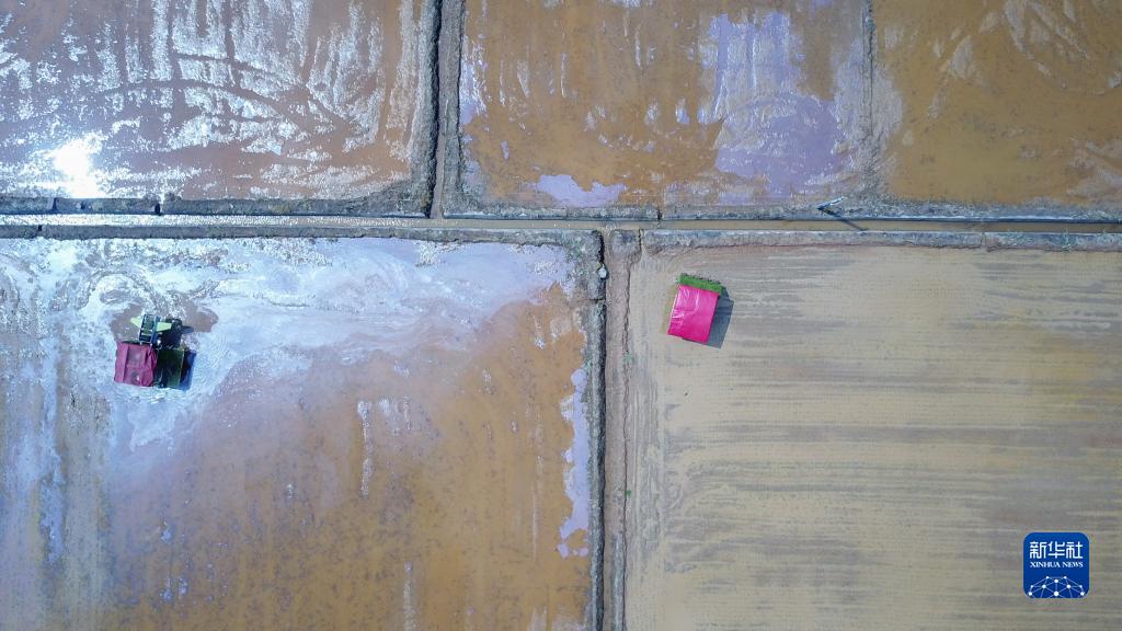 3月31日,在湖南省浏阳市龙伏镇的双季稻种植示范基地,农民驾驶抛秧机、插秧机进行抛秧、插秧作业(无人机照片)。