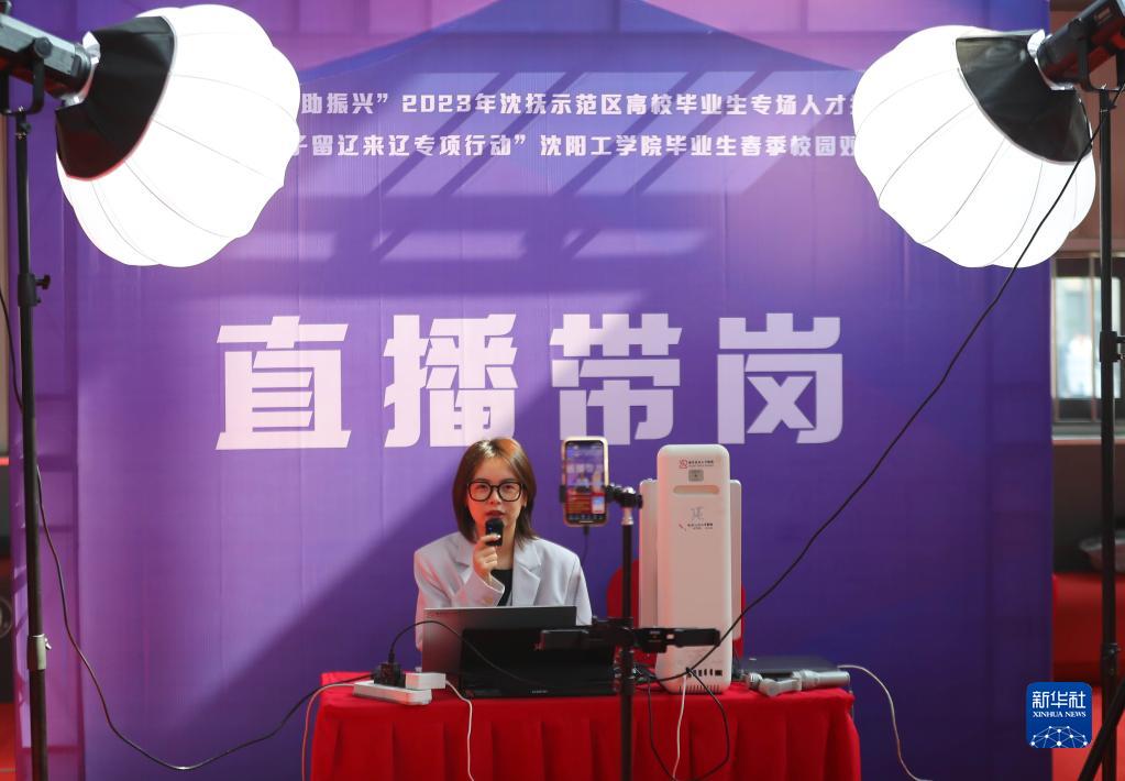 3月31日,在沈阳工学院体育馆,直播带岗专区工作人员通过网络平台对双选会进行直播,满足不能到场学生的就业需求。