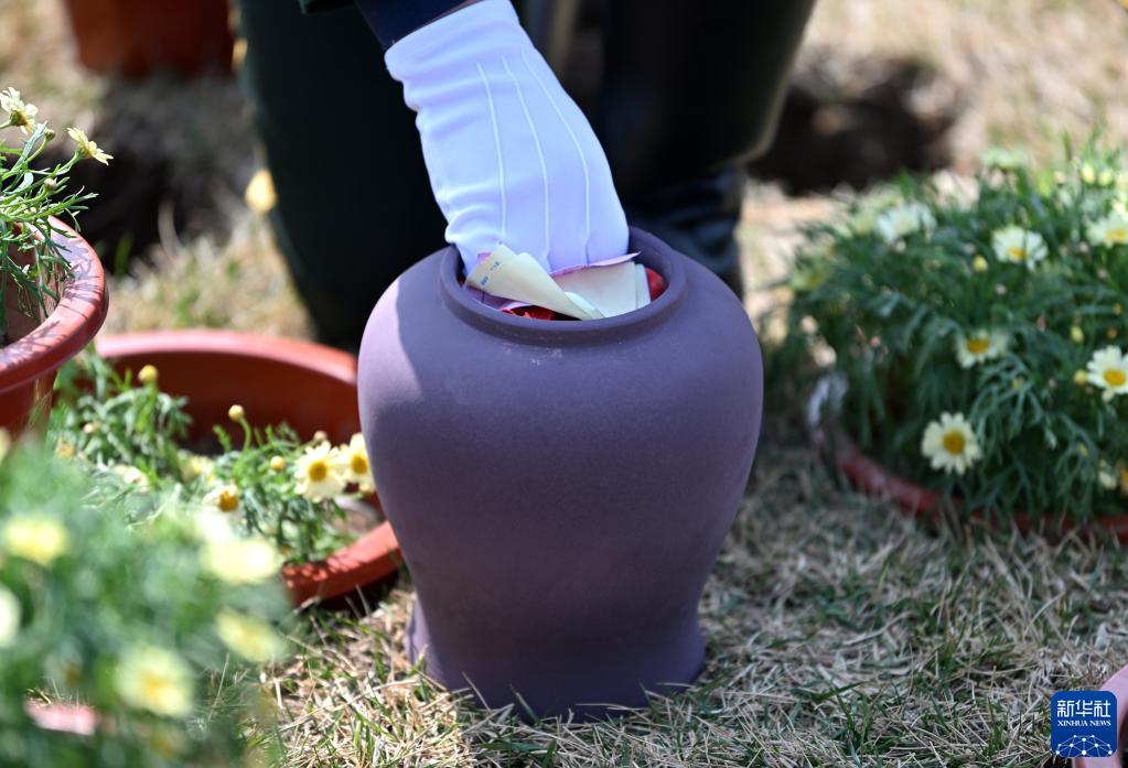 3月31日,在天津憩园,礼仪人员准备将可降解骨灰坛放入穴坑。