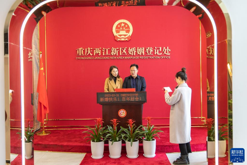 3月31日,在重庆市两江新区婚姻登记处的颁证厅,一对新人在颁证人员的见证下宣读结婚誓言。