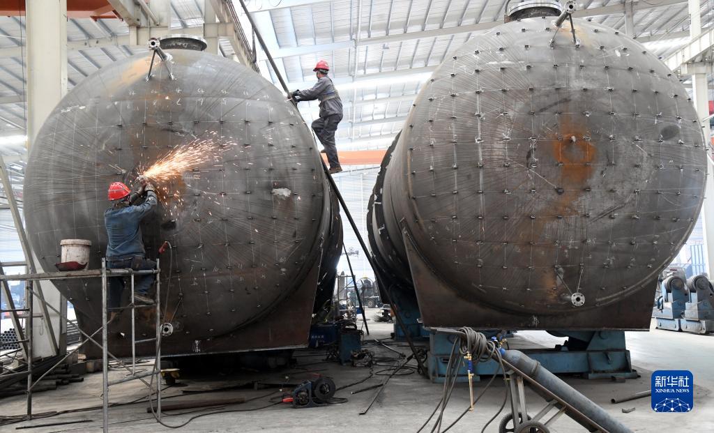 3月29日,山东省新泰市一家重工科技公司的工人在对储罐进行外表面打磨清理。