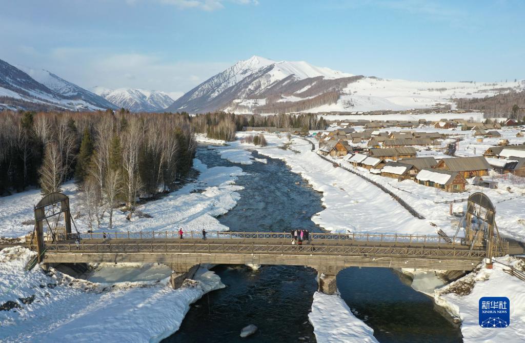 3月29日,游客在禾木村的桥上合影留念(无人机照片)。