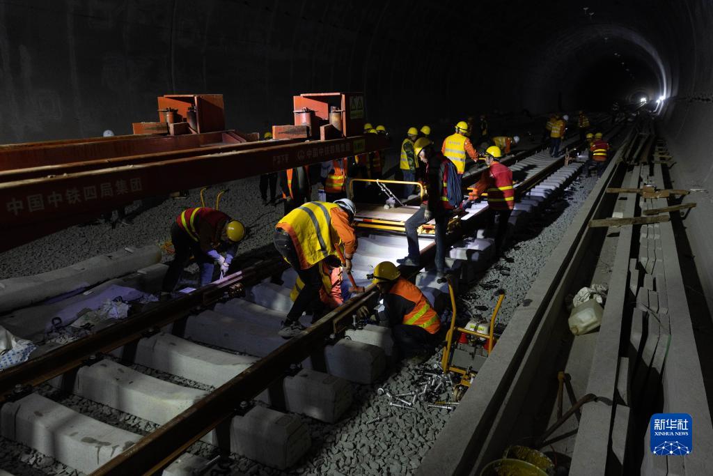 在汉巴南铁路东华山隧道里,中铁四局的施工人员在铺设轨道(3月30日摄)。