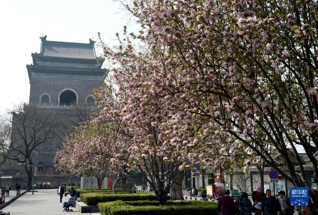 3月31日拍摄的鲜花掩映下的北京钟楼。