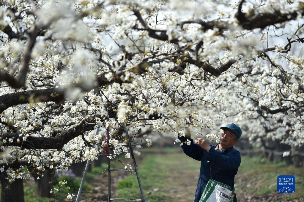 3月30日,河北省石家庄晋州市周家庄乡第九生产队的果农在梨园内疏花。