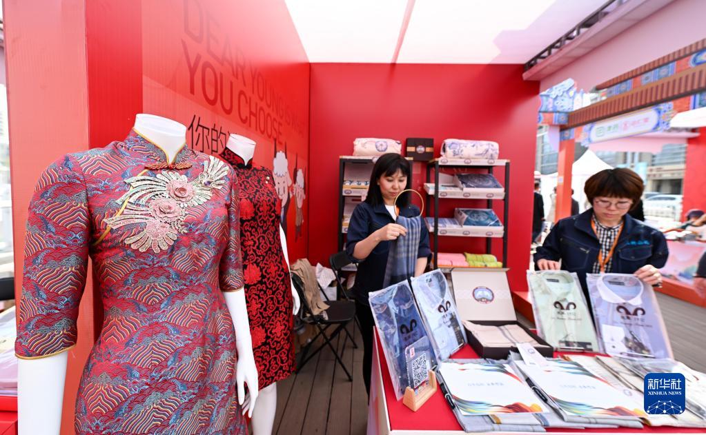 3月31日,津城老字号品牌展商在天津海河古文化街亲水平台上摆放展品。