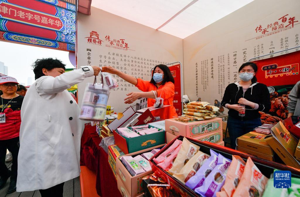 3月31日,在天津海河古文化街亲水平台,游客购买津城老字号品牌桂发祥的商品。